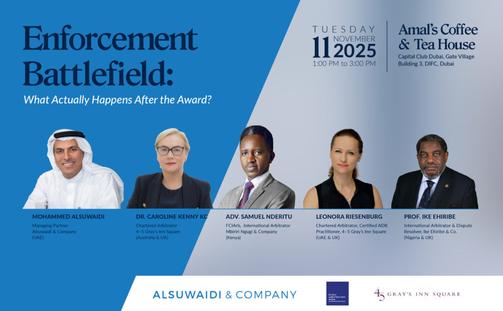 Join us for a focused panel discussion taking place during Dubai Arbitration Week 2025, co-hosted by Alsuwaidi & Company and 4–5 Gray’s Inn Square. This in-person event will explore the realities of enforcing arbitral awards across jurisdictions. Speakers will address practical risks, procedural inconsistencies, and jurisdictional hurdles in award enforcement. The session brings together regional […]